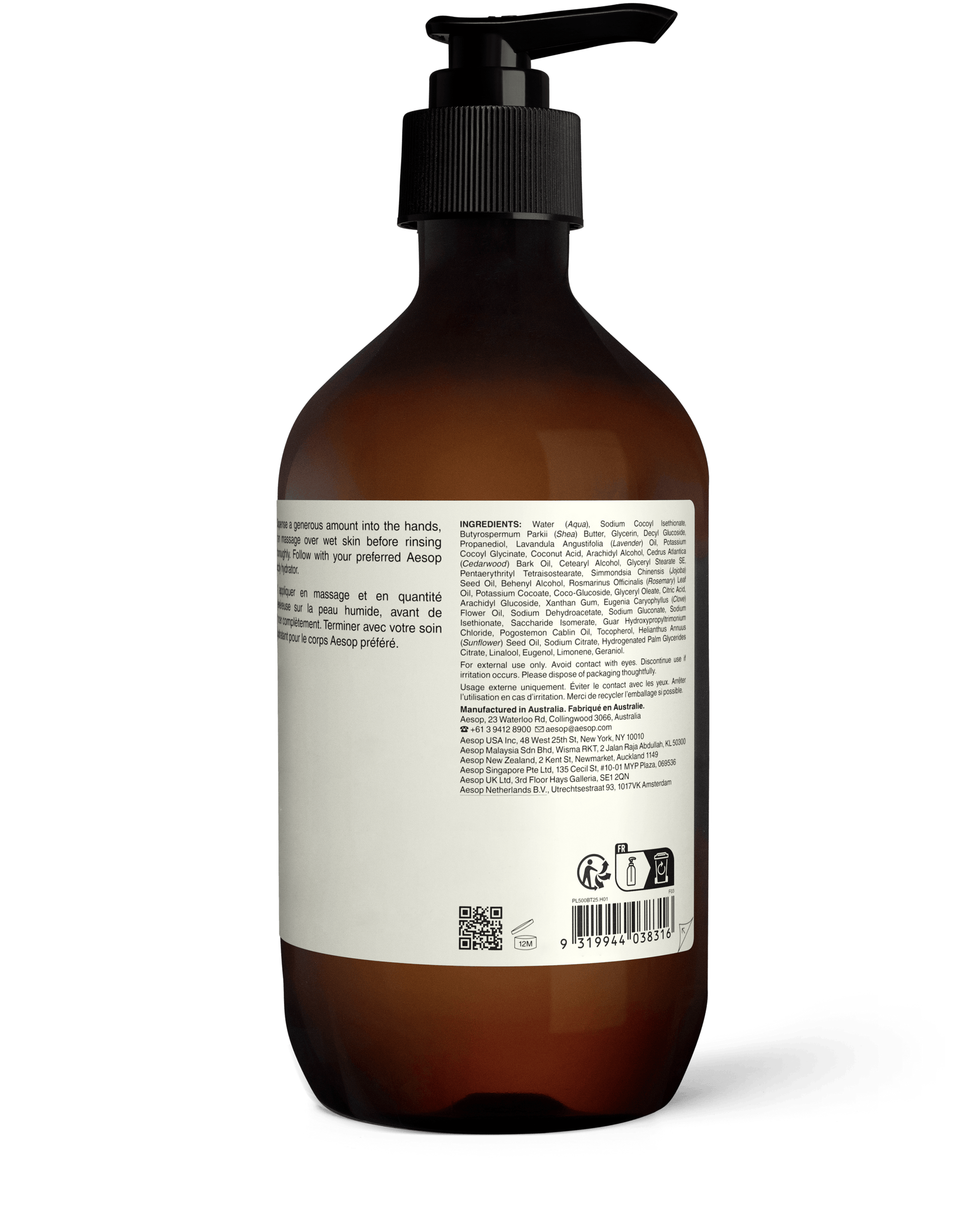 Water (Aqua), Sodium Cocoyl Isethionate, Butyrospermum Parkii (Shea) Butter, Glycerin, Decyl Glucoside, Propanediol, Lavandula Angustifolia (Lavender) Oil, Potassium Cocoyl Glycinate, Coconut Acid, Arachidyl Alcohol, Cedrus Atlantica (Cedarwood) Bark Oil, Cetearyl Alcohol, Glyceryl Stearate SE, Pentaerythrityl Tetraisostearate, Simmondsia Chinensis (Jojoba) Seed Oil, Behenyl Alcohol, Rosmarinus Officinalis (Rosemary) Leaf Oil, Potassium Cocoate, Coco-Glucoside, Glyceryl Oleate, Citric Acid, Arachidyl Glucoside, Xanthan Gum, Eugenia Caryophyllus (Clove) Flower Oil, Sodium Dehydroacetate, Sodium Gluconate, Sodium Isethionate, Saccharide Isomerate, Guar Hydroxypropyltrimonium Chloride, Pogostemon Cablin Oil, Tocopherol, Helianthus Annuus (Sunflower) Seed Oil, Sodium Citrate, Hydrogenated Palm Glycerides Citrate, Linalool, Eugenol, Limonene, Geraniol.