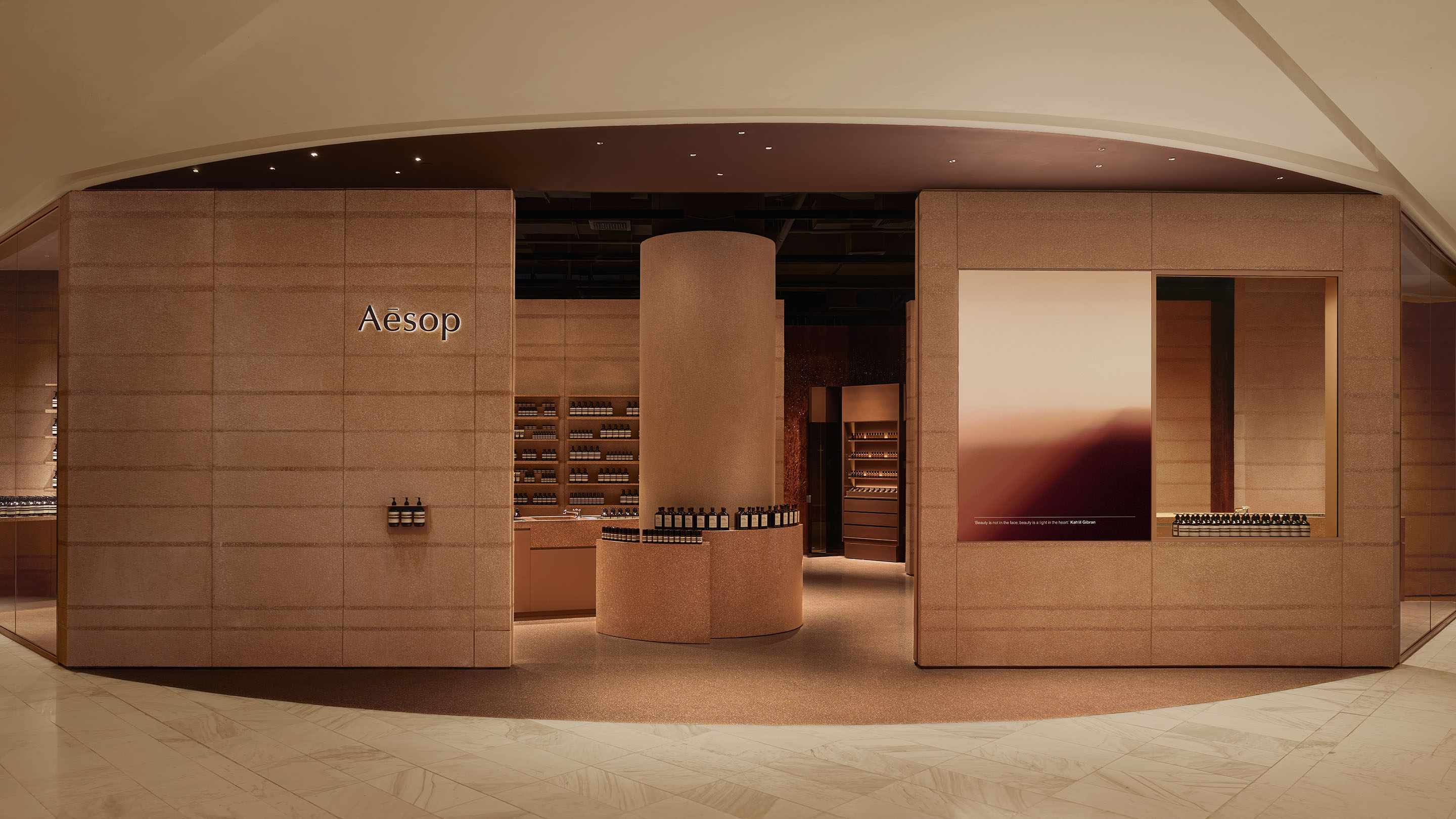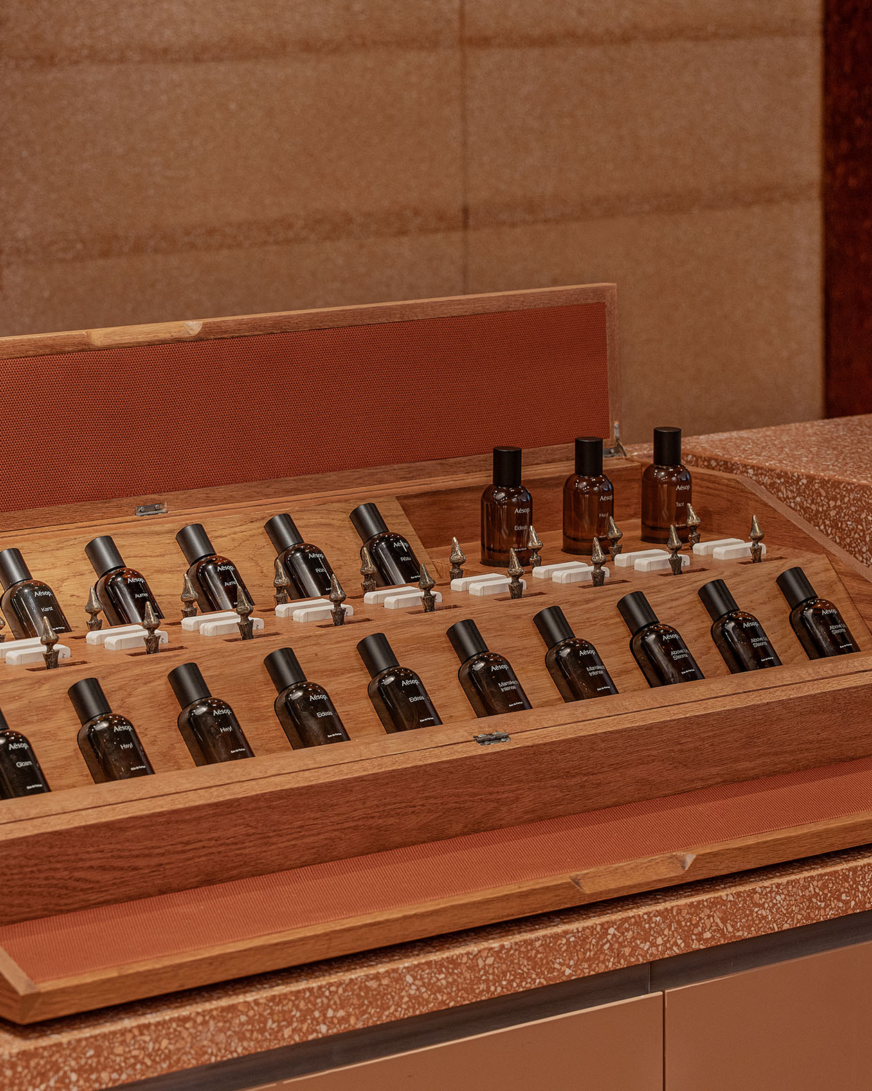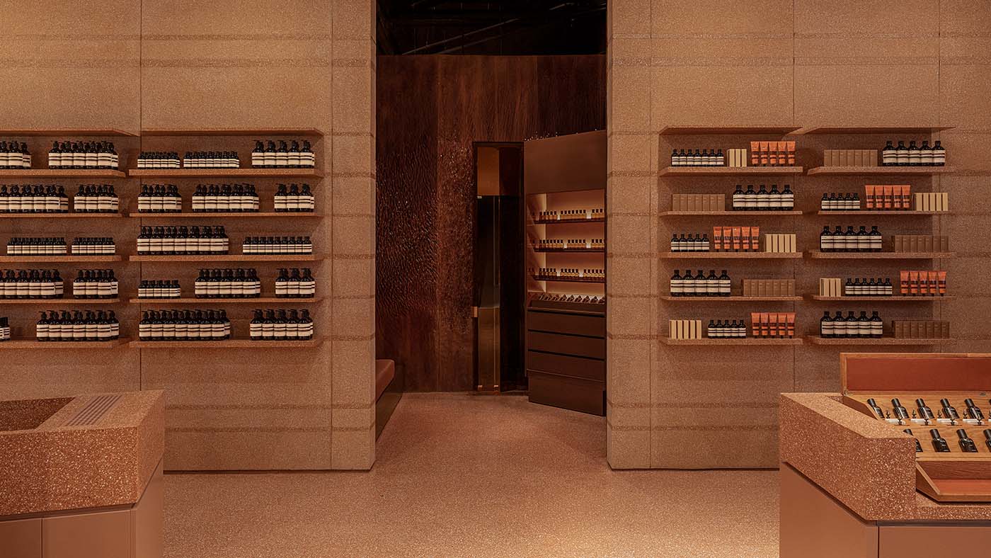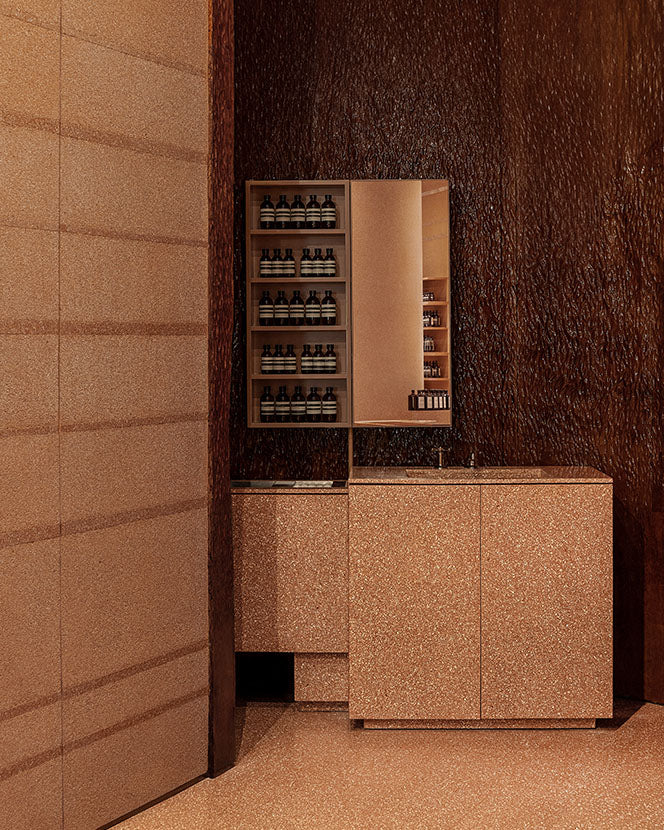 อย่างไรก็ตาม ความเข้มงวดของแบบแผนกริดถูกผ่อนปรนลงในบริเวณสองมุมเว้าที่จัดไว้สำหรับโซนสกินแคร์และน้ำหอม ผนังโค้งเว้านี้ถือกำเนิดจากแรงบันดาลใจของศิลปิน Ori Orisun Merhav ผู้ซึ่งเคยใช้เวลาอยู่ในป่าของไทย ในช่วงเวลานั้น เธอค้นพบแมลงสีแดงที่เรียกว่า ครั่ง (Kerria lacca) ซึ่งยางเรซินของแมลงเหล่านี้ถูกนำมาใช้ผลิตเชลแลก (shellac) เมื่อผ่านกรรมวิธีอันประณีต เรซินชนิดนี้มีคุณสมบัติคล้ายแก้ว และทำหน้าที่เป็นแลคเกอร์สีอำพันเคลือบผิวไม้ในมุมโค้งเว้าดังกล่าว มอบประกายแวววาวอย่างเป็นธรรมชาติแต่ทว่าลึกลับน่าค้นหา เสมือนถูกแกะสลักออกจากลำต้นไม้ใหญ่ พื้นที่ตำแหน่งนี้จึงนำเสนอเส้นโค้งเว้าและการเลื้อยไหลอย่างอิสระ เป็นบทตอบรับอันนุ่มนวลต่อความแข็งแกร่งของคอนกรีต